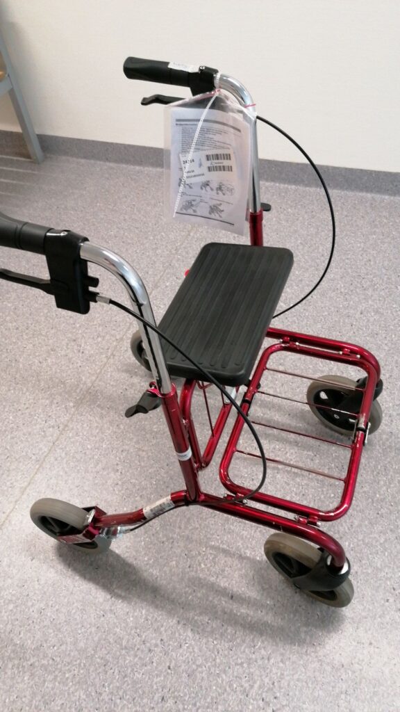 Wat was ik blij te zien dat de rollator rood was en niet saai grijs. Na het eerste oefenrondje was ik om. Ik loop af en toe nog steeds alsof ik een fles Jack Daniels op heb, maar nu heb ik iets wat zorgt dat ik in het gereel blijf. Nu botst eerst mijn rollator ergens tegenaan en niet ik.